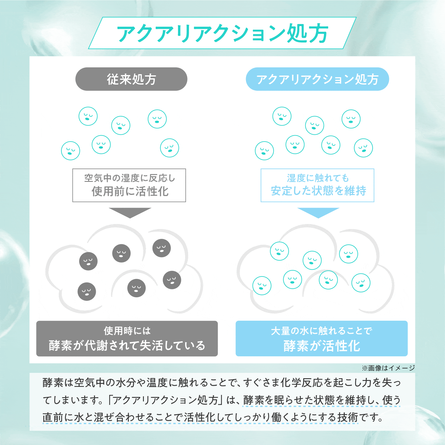 黒ずみ毛穴の原因となるたんぱく汚れ&角栓の原因となる皮脂汚れをWの酵素が分解し、多孔質な炭が汚れを吸着!アクアリアクション処方で眠っていた酵素が泡立てた時に加えた水分と肌の温度で活性化。ゴシゴシ擦らなくても、毛穴汚れをしっかり落とします。