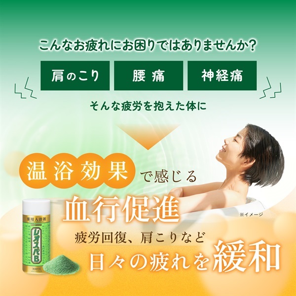 日本初!薬用酵素入浴剤。浴用レオスパBは発売から45年以上愛され続けています。活きたままの酵素を配合。創業当初から酵素を研究し続け、たどり着いた独自ブレンドのトリプル有効成分が短時間で体を芯まで温め、腰痛・肩こり・冷え症を改善!お湯あたりも滑らかで、湯上がり肌はつるっつる。