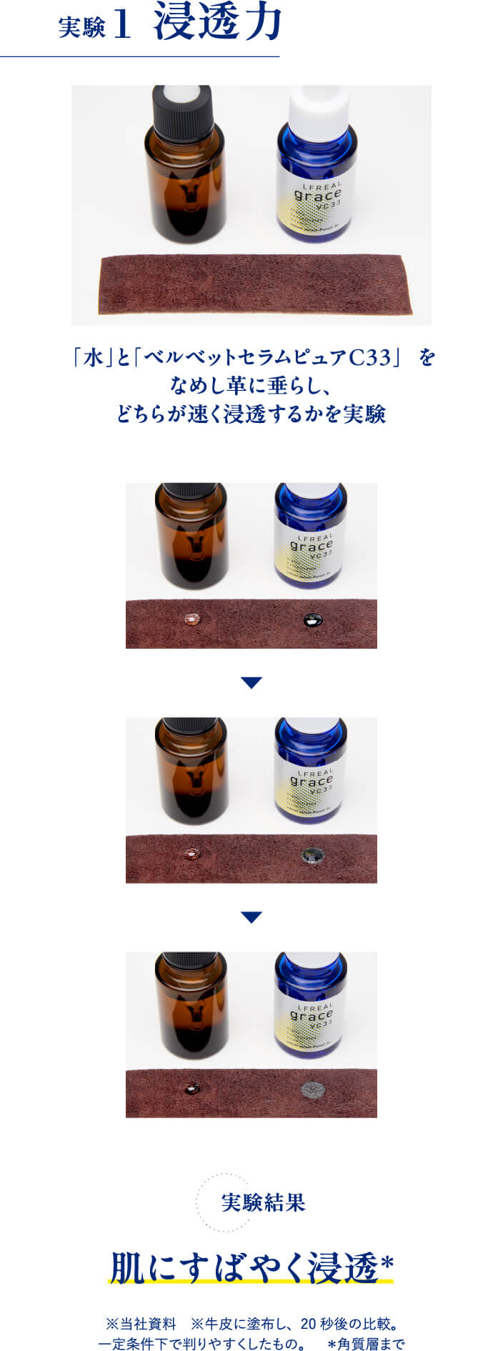 ベルベットセラムピュアC33は、純粋なビタミンCを高濃度配合しています。ビタミンCはたくさんの量を入れるとベタつきやすい特徴があり朝の使用には不向きなことも。メイクの邪魔はせず、毎日の使いやすさを追求しつつ、しっかりとビタミンCのチカラを感じられる配合量を追い求め、VC33にたどり着きました。肌の奥まで美容液がみるみる溶け込む濃厚な1滴をおためしください。